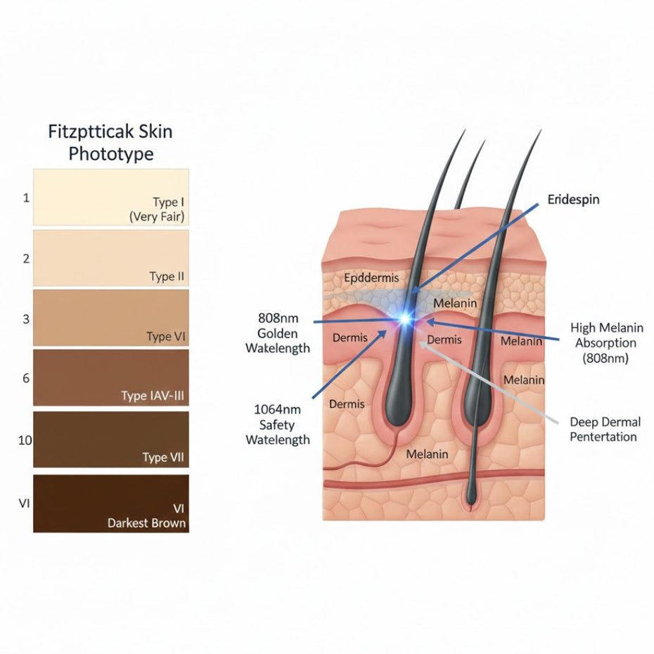 - Type I-III (Light Skin Tones): Primary focus on the 808nm Golden Wavelength. This band features an exceptionally high absorption peak for melanin, enabling it to efficiently inhibit hair follicle germinative functions and disrupt the follicle growth environment through targeted photothermal action within a short pulse duration.